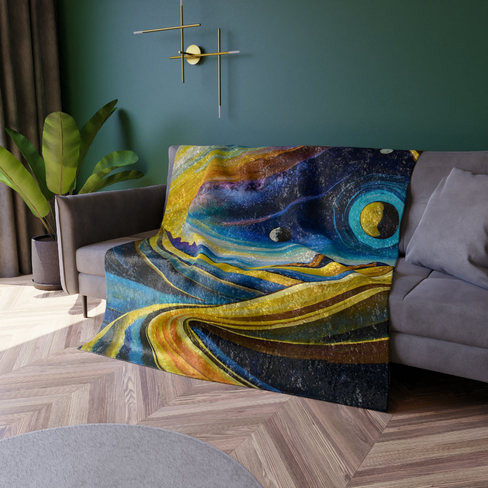 Galactic Splendor: This isn't just a blanket; it's a masterpiece draped in the artwork of the universe. With a glossy finish and neatly hemmed edges, it becomes a beacon of creativity, inspiring little ones with patterns of planets and stardust.